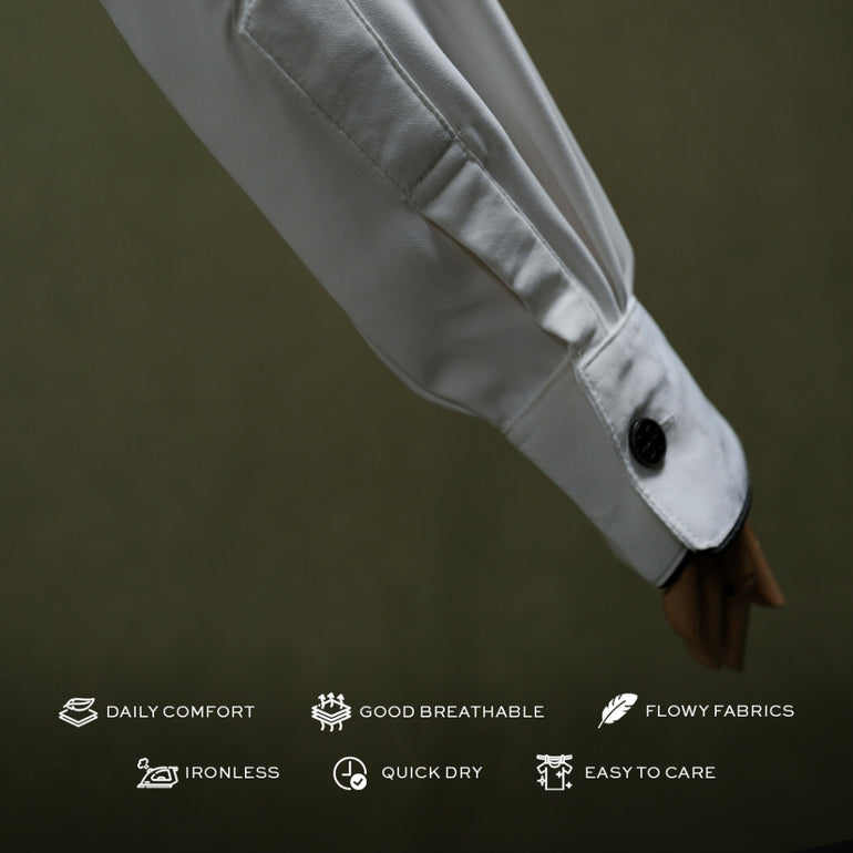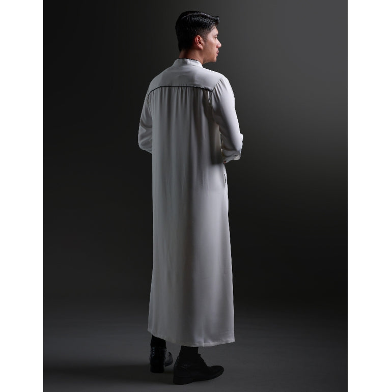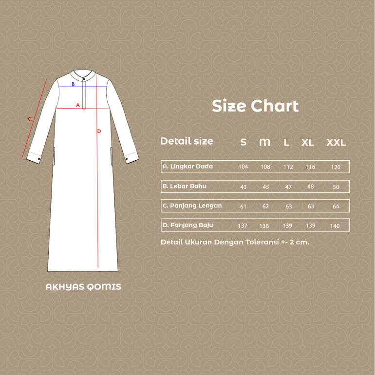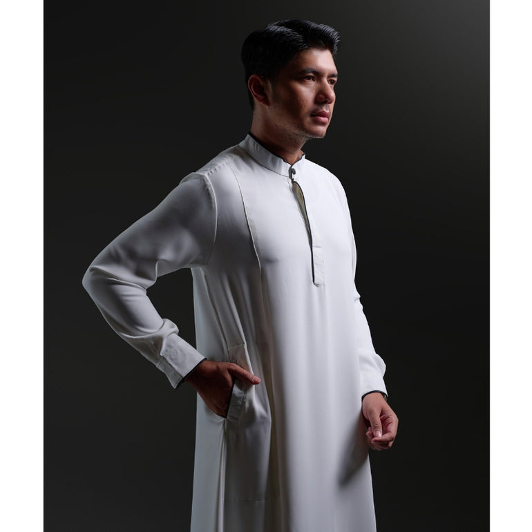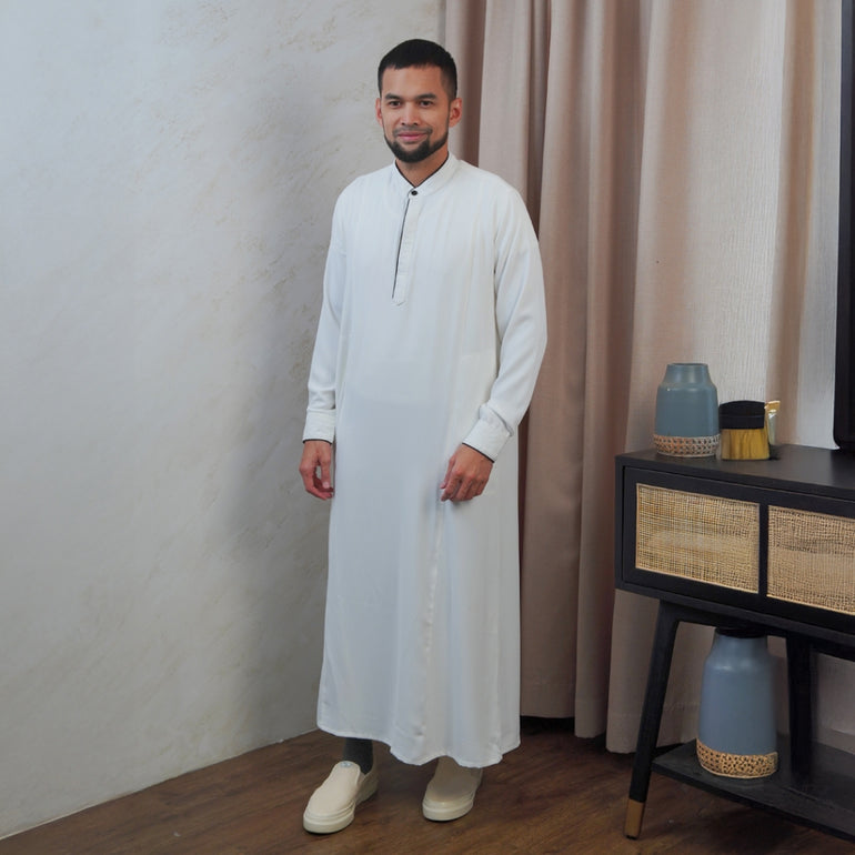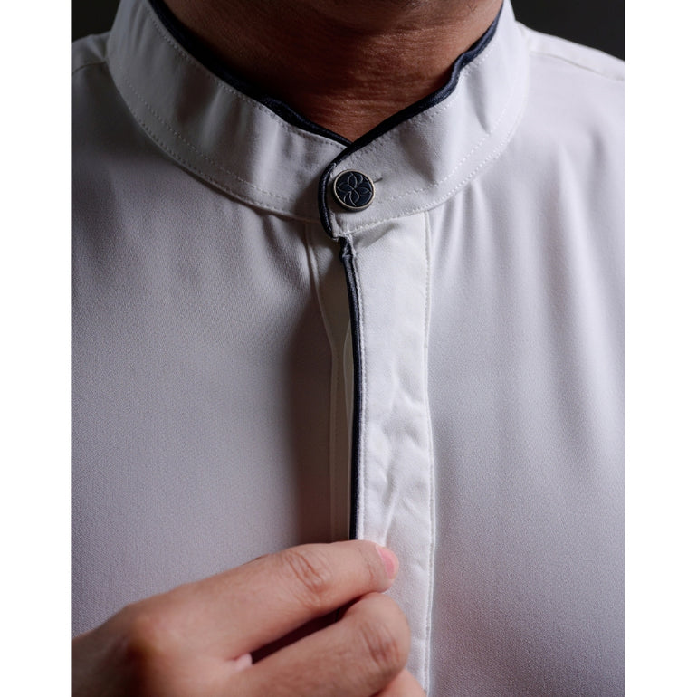 Qomish lengan panjang dan kerah Shanghai yang klasik. Baju ini memiliki bukaan kancing di bagian depan hingga dada, sehingga memudahkan pengguna dalam mengenakannya. dengan details lis bisban di bagian kerah, ujung manset dan saku kanan kirinya. Selain itu, qomish ini dilengkapi dengan kantong sisi kanan dan kiri yang sangat berguna sebagai tempat menyimpan benda-benda kecil. Dan terdapat kancing logo di bagian atas kerahnya. Bagi pria yang ingin tampil maskulin dan elegan dalam acara-acara formal maupun informal, qomish lengan panjang kerah shanghai ini dapat menjadi pilihan yang tepat.