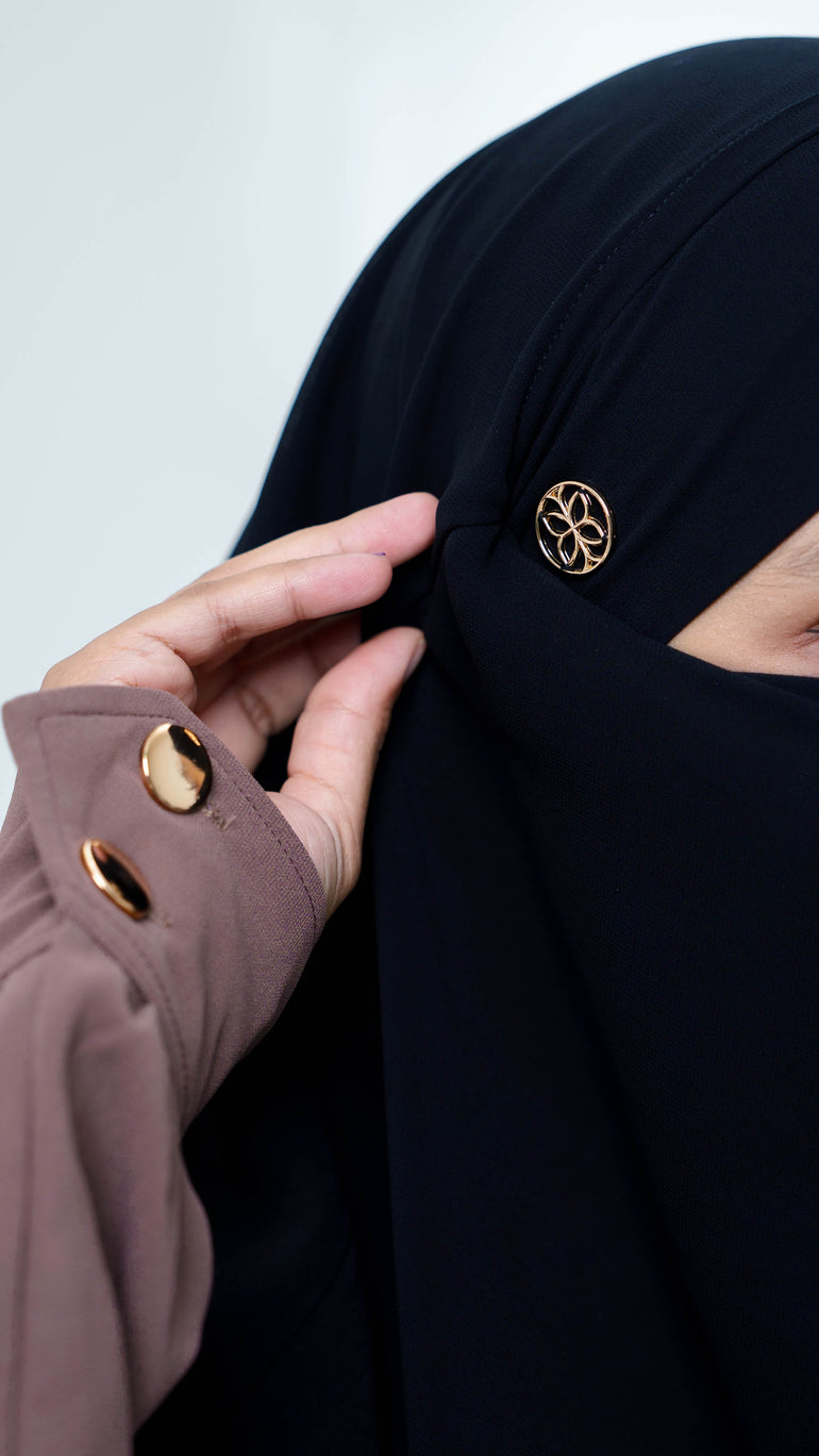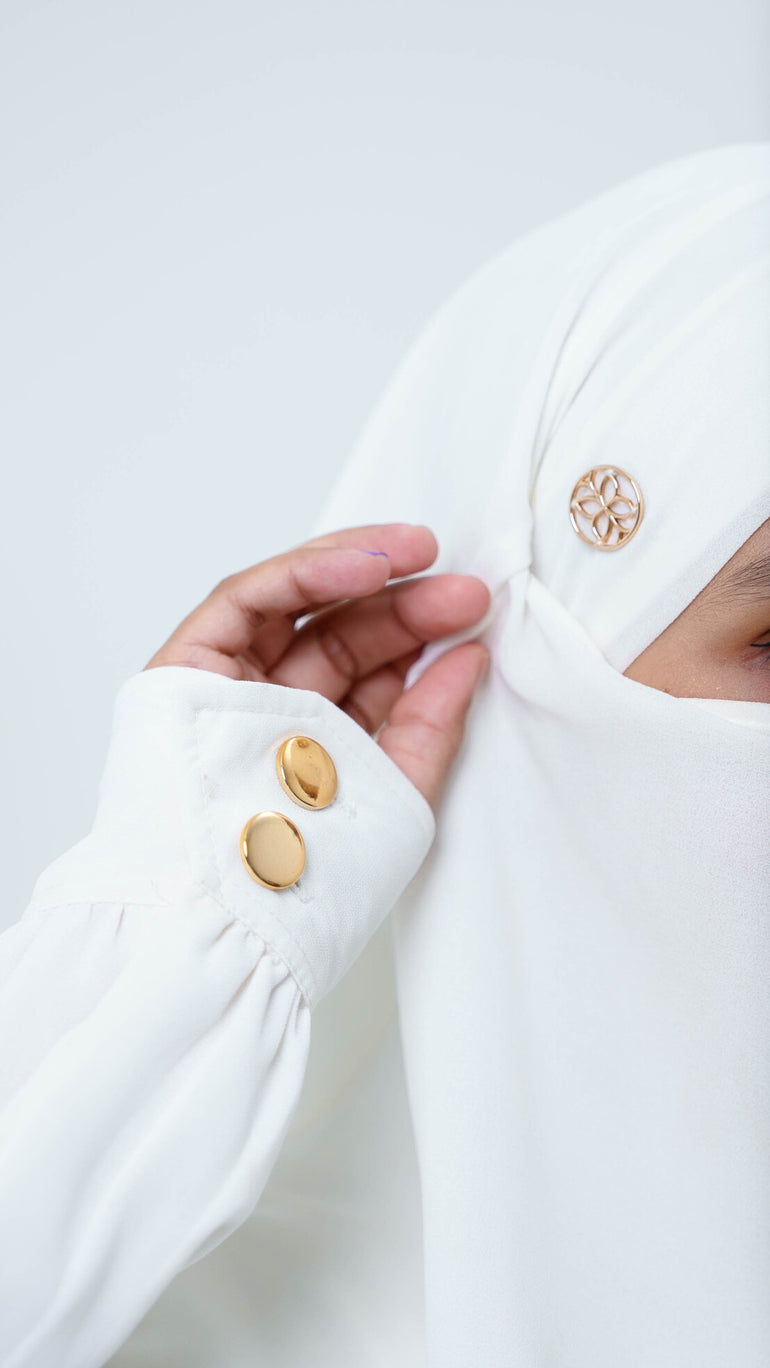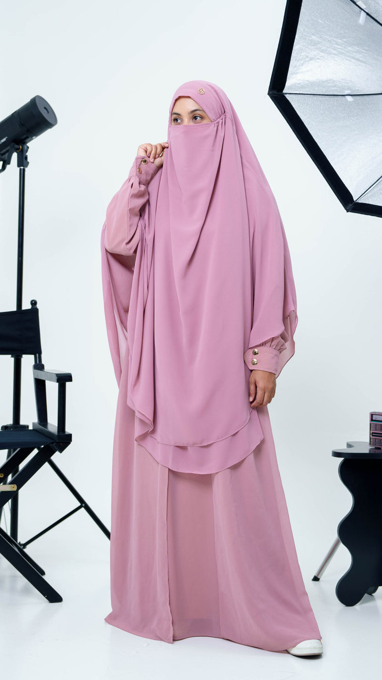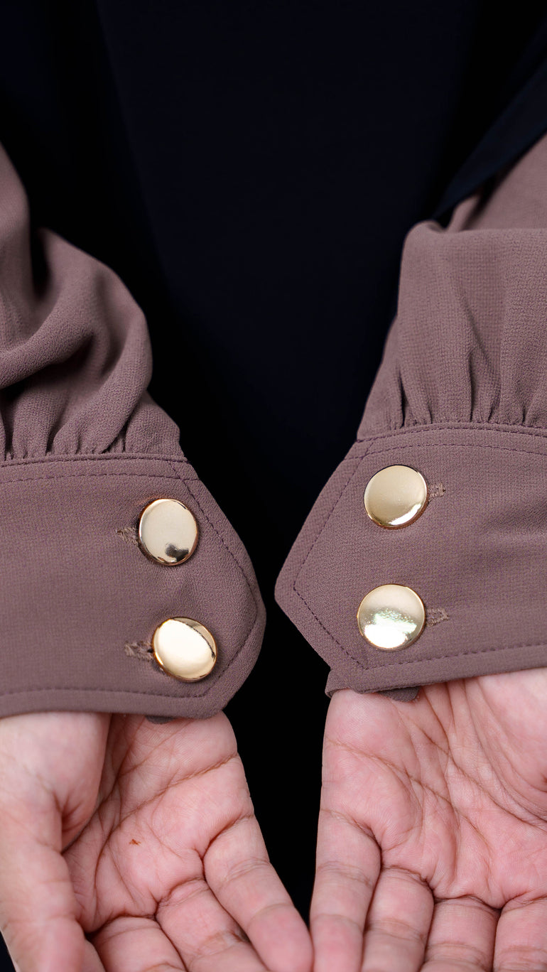 Dress kerah bulat dengan bukaan kancing depan sampai bawah dada yang memudahkan pemakai untuk mengenakannya (busui friendly).  Dengan details bagian depan seperti aksen rompi,yang membuat tampilan dress semakin klasik dan menarik.  Di bagian pergelangan tangannya terdapat detail aksen kancing hias warna gold yang memudahkan pemakai mengenakannya (wudhu friendly). Dress ini cocok dipakai untuk berbagai acara, seperti acara formal atau informal, terutama ketika melaksanakan ibadah umroh.