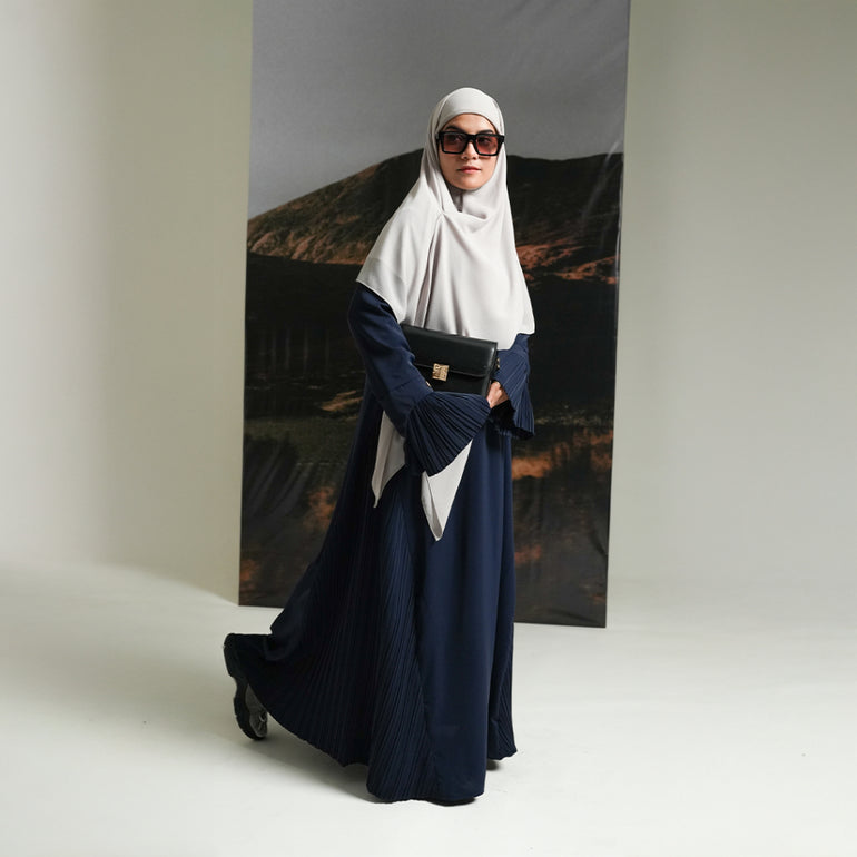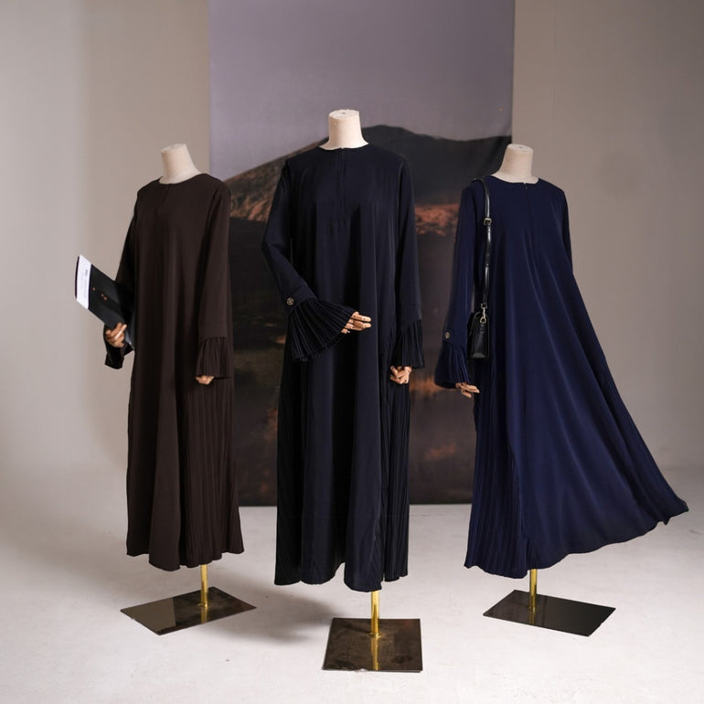 Dress kerah bulat dengan bukaan resleting depan sampai dada yang memudahkan pemakai untuk mengenakannya (busui friendly). dengan details pleats di samping kanan kiri dan dibagian pergelangan tangan terdapat details pleats beresleting dibawahnya juga plat berlogo gerai hawa sebelah kanan, untuk memudahkan pemakai mengenakannya (wudhu friendly), yang membuat tampilan dress semakin klasik dan menarik. Dress ini cocok dipakai untuk berbagai acara, seperti acara formal atau informal.