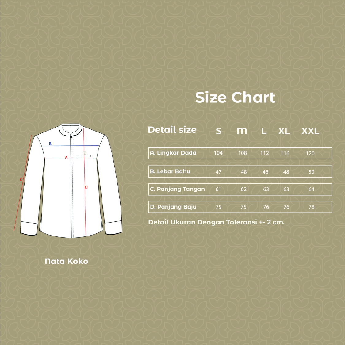 Kemeja koko lengan panjang kerah shanghai, dengan bukaan kancing dalam bagian depan. Ditambah aksen list bisban di bagian kerah ujung manset dan bagian belakang cutting punggung. Terdapat kantong bobok dan logo bordir Gerai Hawa. Koko ini cocok untuk acara formal dan non formal.