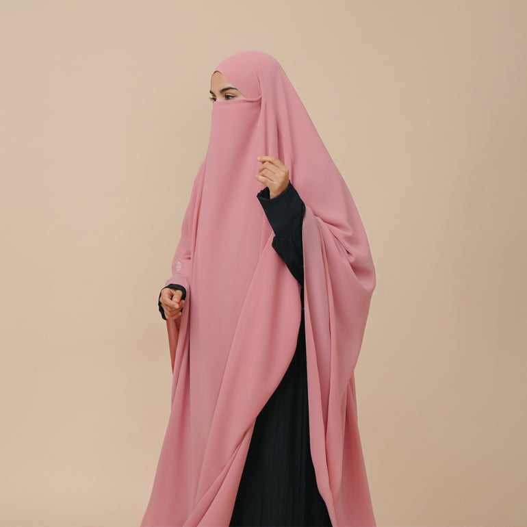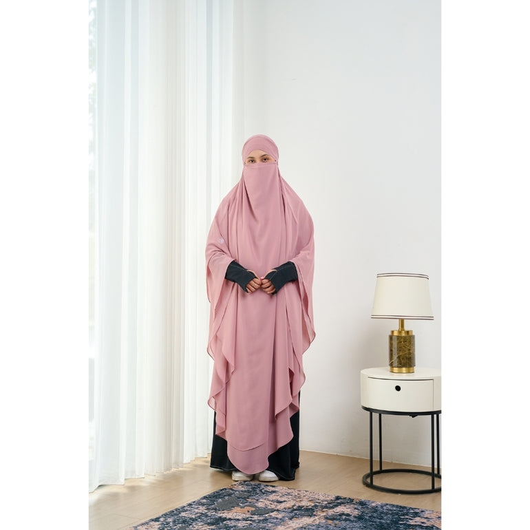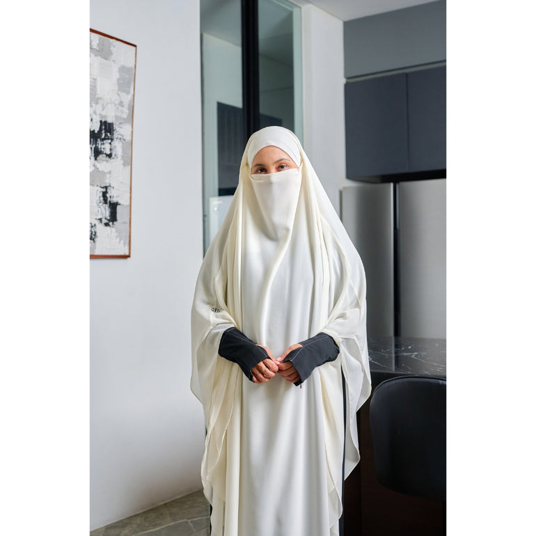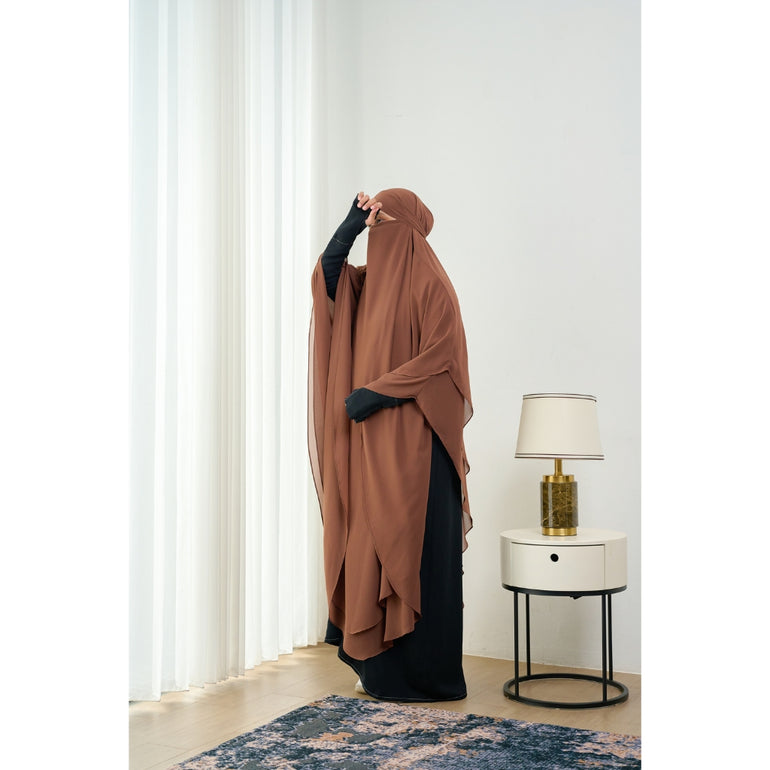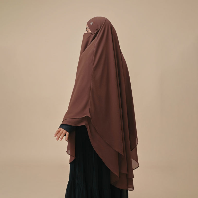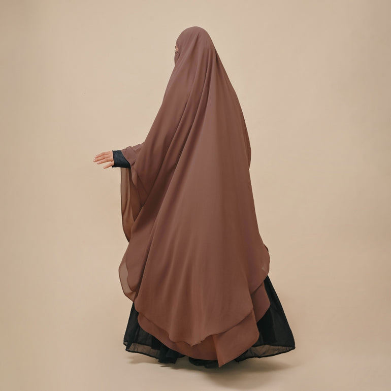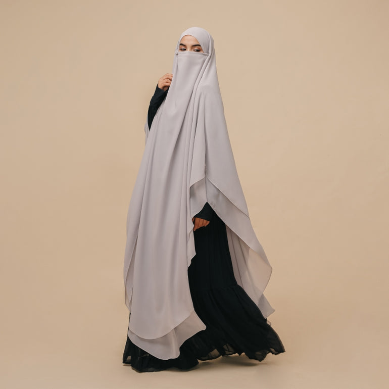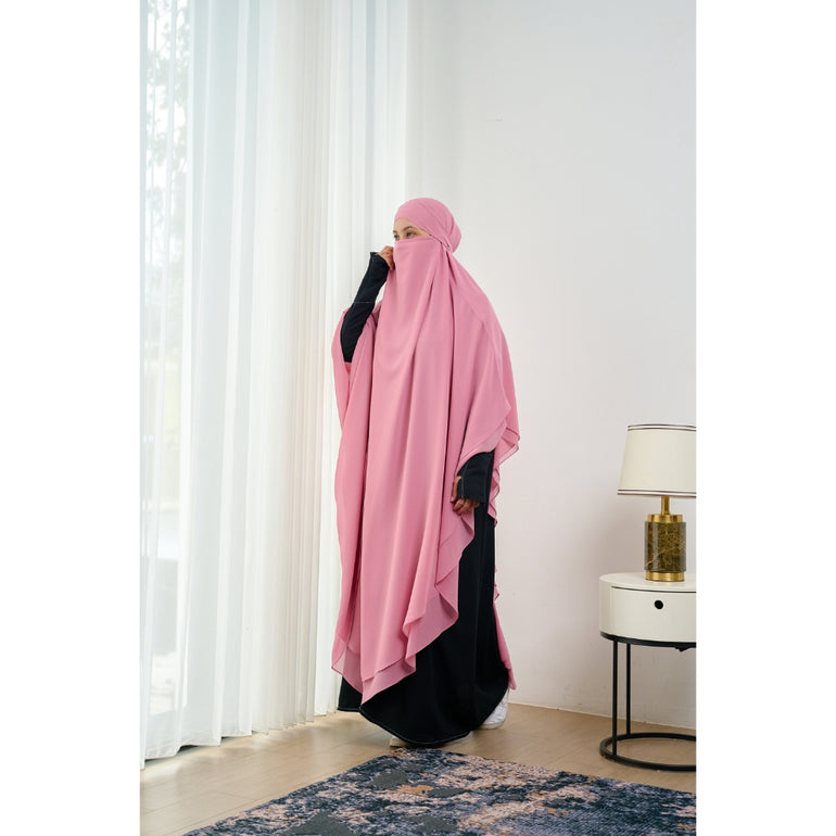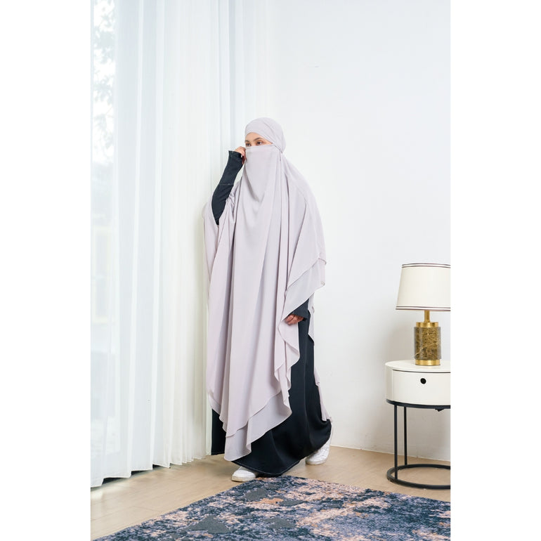 French khimar panjang 2 lapis dengan tali kecil dibagian dalam sebagai pengikat untuk aksen cadar. khimar ini cocok di kegiatan sehari-hari, baik di acara formal maupun informal.
