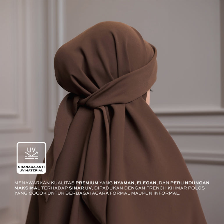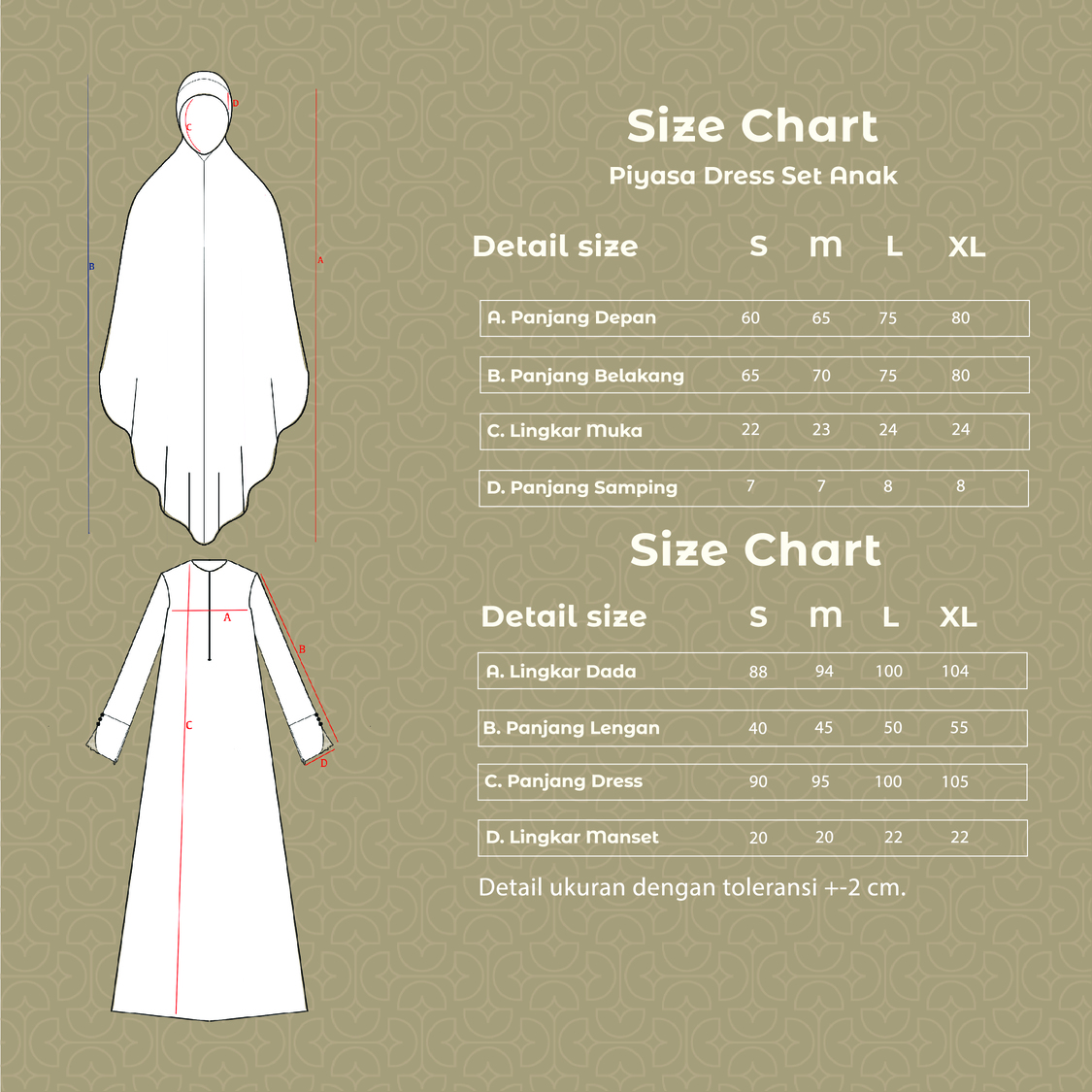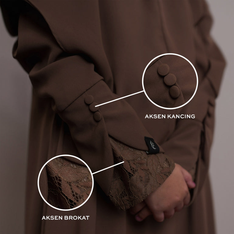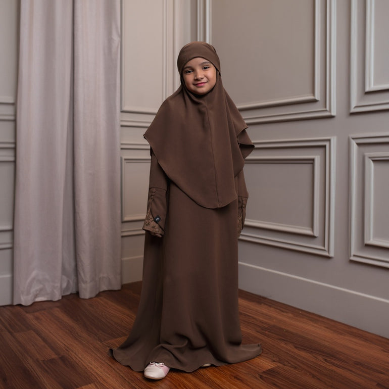 (Dress set) Dress anak , Dress kerah bulat dengan bukaan resleting depan sampai dada yang memudahkan pemakai untuk mengenakannya (busui friendly) dengan details kancing bungkus dan aksen brokat di ujung lengan, juga resleting dibawahnya untuk memudahkan pemakai mengenakannya (wudhu friendly), di bagian tengah ujung lengan sebelah kanan terdapat label logo arab Gerai Hawa. Dipadukan dengan French Khimar polos dengan details segitiga di bagian dagunya. Dress ini cocok dipakai untuk berbagai acara, seperti acara formal atau informal. terutama ketika melaksanakan ibadah umroh.