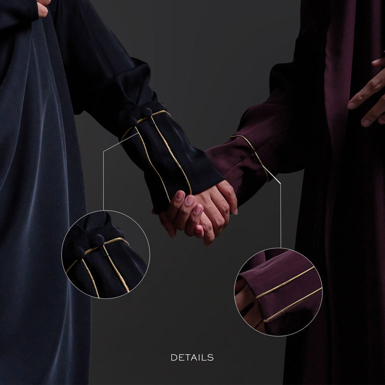 (Dress set) Dress kerah bulat dengan bukaan kancing depan sampai bawah yang memudahkan pemakai untuk mengenakannya (busui friendly).  dengan details kancing bungkus 2pcs dan lis warna gold di bagian ujung lengan juga resleting dibawahnya untuk memudahkan pemakai mengenakannya (wudhu friendly), di bagian ujung lengan sebelah kanan terdapat logo label Gerai Hawa. dipadukan dengan french khimar. Dress ini cocok dipakai untuk berbagai acara, seperti acara formal atau informal.