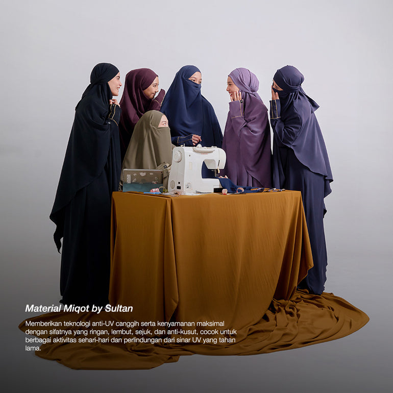 Miqot ciri ringan, tenun satin micro twill yang halus (kombinasi Mina dan Mazen), rapat, lembut, empuk, kenyal, warna dull, dingin, proteksi UV permanen, sedikit kilap (samar), dan sedikit lentur.