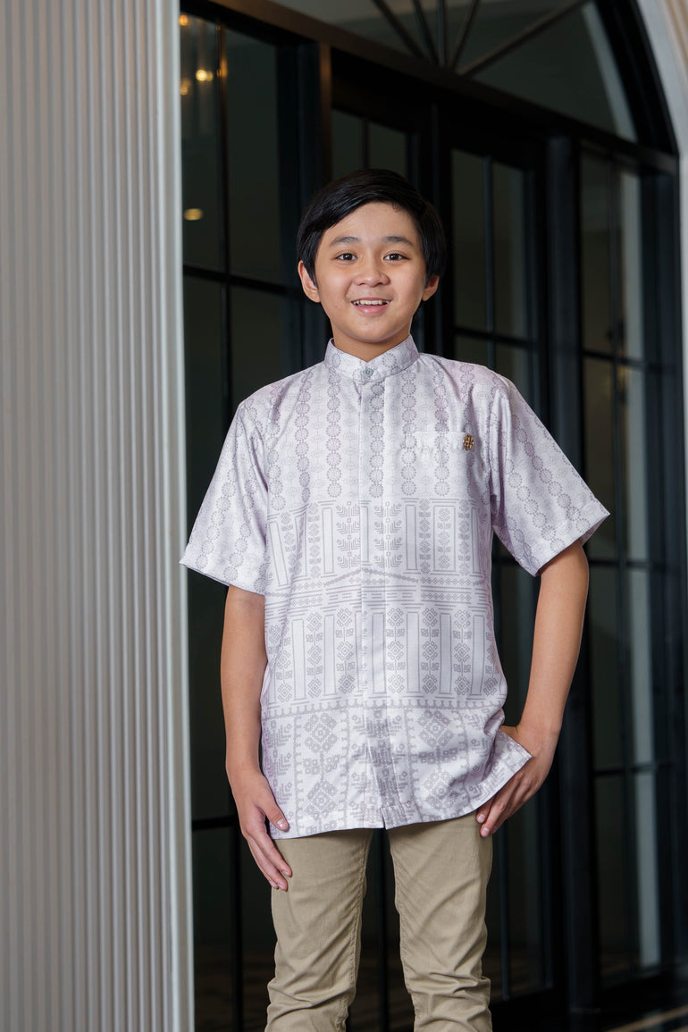 Kemeja anak motif print logo gerai hawa aksen kerah shanghai lengan pendek dengan bukaan full kancing dalam bagian depan, dan plat logo gerai hawa di kantongnya. kemeja Koko pria lengan pendek motif ini sangat cocok untuk para pria yang ingin menampilkan stil modern dan elegan, baik untuk kegiatan formal maupun informal.
