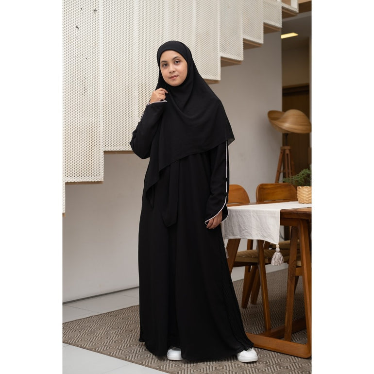 Dress kerah bulat dengan bukaan resleting depan sampai bawah dada yang memudahkan pemakai untuk mengenakannya (busui friendly). Dengan Aksen bukaan klep depan dan detail lis dibagian lengannya, juga bentuk lengan yang lebar memudahkan pemakai mengenakannya (wudhu friendly). dibagian belakang dress terdapat details cutting bahan yg di pleats. Dress ini cocok dipakai untuk berbagai acara, seperti acara formal atau informal.
